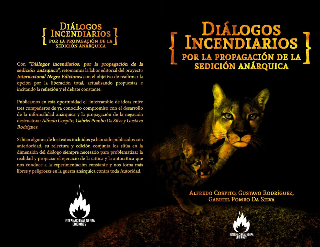 Presentamos un nuevo libro de la Internacional Negra Ediciones, proyecto internacionalista de difusión anárquica que, desde voluntades anarcoinsurreccionales informales y sediciosas, vuelve a resurgir en español, portugués e italiano con un nuevo título: «Diálogos Incendiarios: por la propagación de la sedición anárquica», cimentado en el intercambio epistolar en torno al curso de la guerra anárquica entre los compañeros Alfredo Cóspito, Gustavo Rodríguez y Gabriel Pombo da Silva.